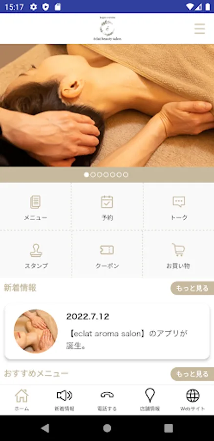 The official app of [eclat aroma salon] is now available. You can receive new information and deals of [eclat aroma salon] in real time through the app. You can also check and make reservations for menus and desired time zones from your smartphone at any time. By installing the app, you can use [eclat aroma salon] more conveniently and easily.