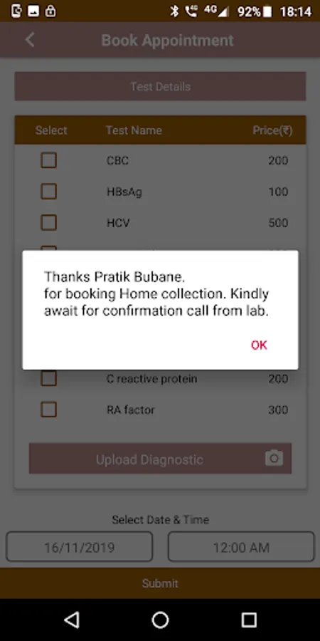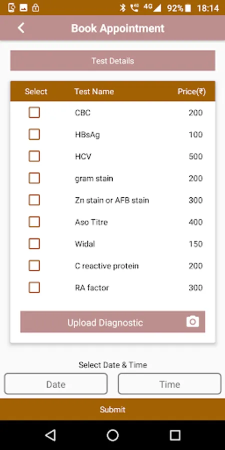 - You can select from pre-loaded tests by Shisodiya Pathology Laboratory or upload the diagnostic test prescribed by your doctor.