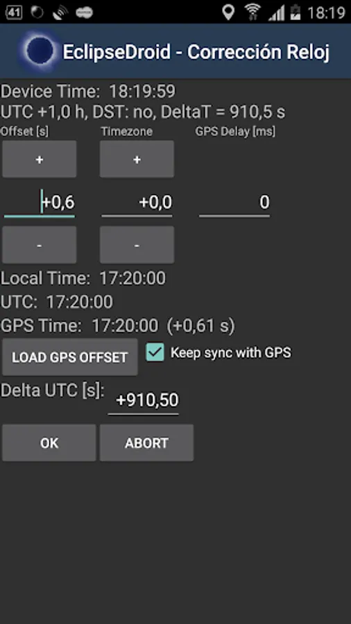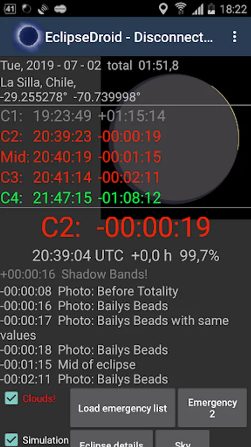 EclipseDroid has several screens and layouts to show the precise contact times for your location. These are the beginning and end of the eclipse (C1 and C4), the beginning and end of the total or annual phase (C2 and C3), the time of mid eclipse and the current percentage of coverage of the solar disk. You have the choice of two layouts: a smart layout showing the local circumstances and an animation of the eclipse in a condensed form or the classic layout with countdowns for all contacts, an events list with the next upcoming events and the actual eclipse view, if the eclipse is running.