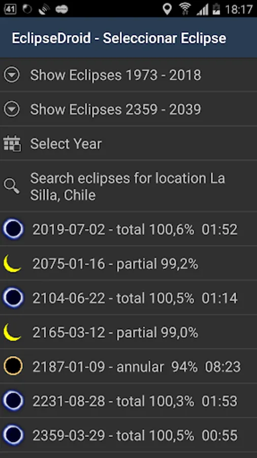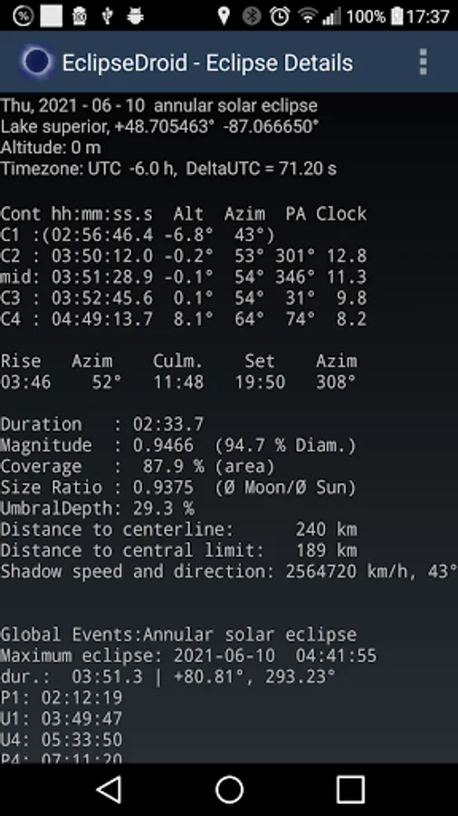 In the 'eclipse details' screen you get full information about the local circumstances of the eclipse. Pressing 'Menu' will add the eclipse to your favorite personal calendar.