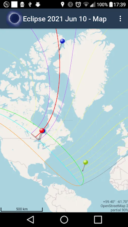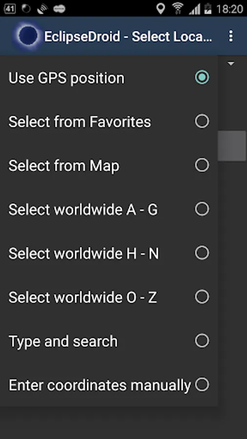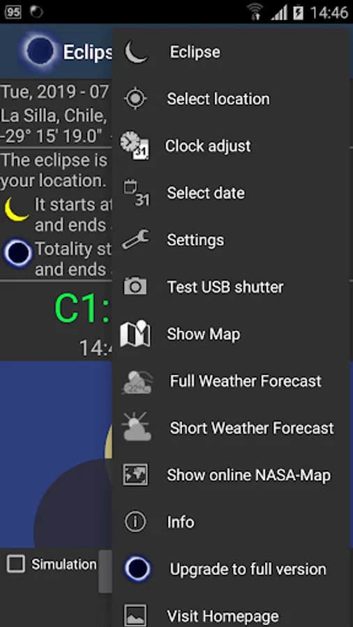 To prepare your eclipse observation, select a desired location from the map, from a list or input free coordinates. To rehearse and check your observation program, simply run EclipseDroid in eclipse simulation mode. When selecting and checking your observation site, avoid unpleasant surprises like buildings or trees blocking your eclipse view! Just call the AR screen of EclipseDroid to see an overlay of the Sun's position at eclipse time with an actual camera image (only availabe in full version).