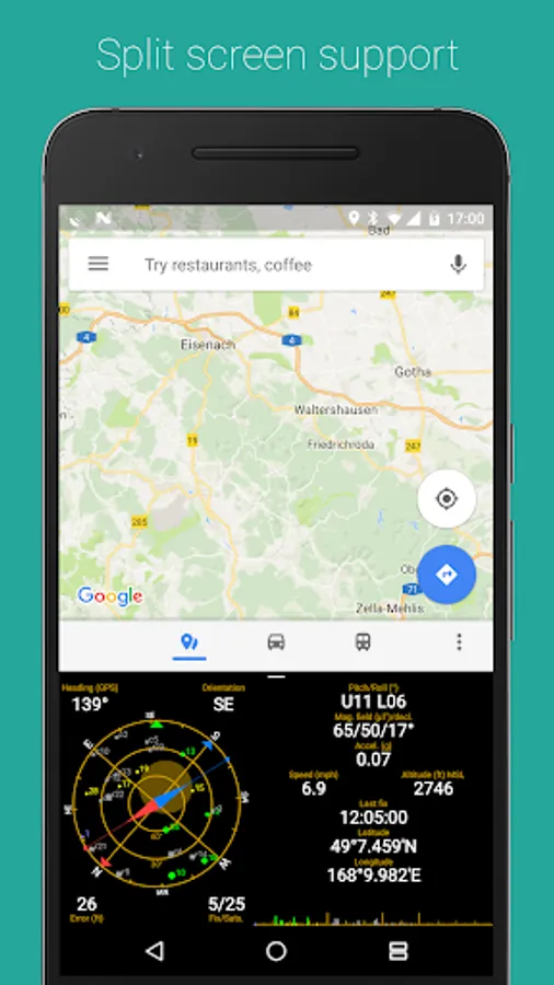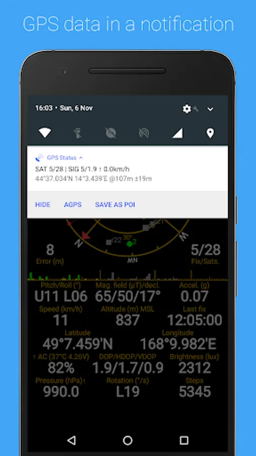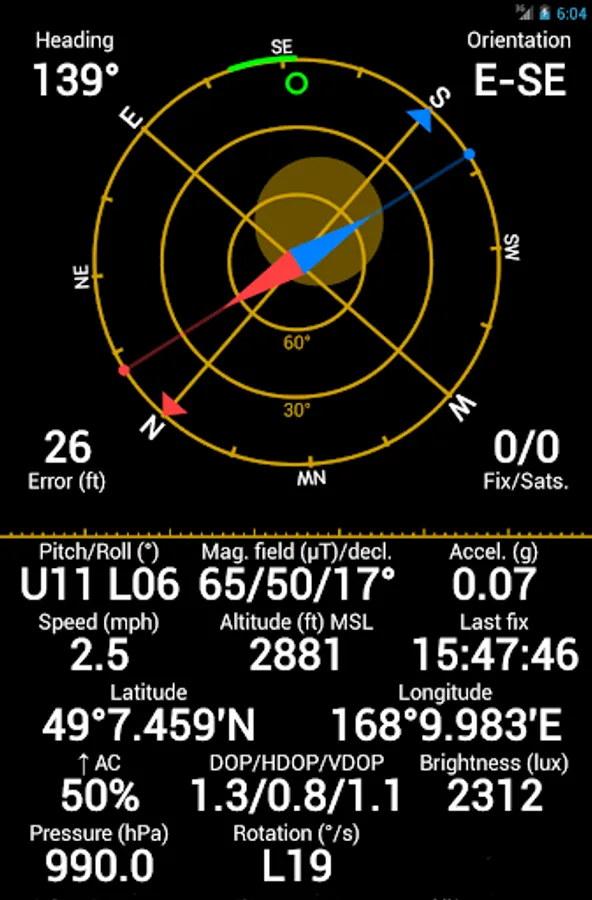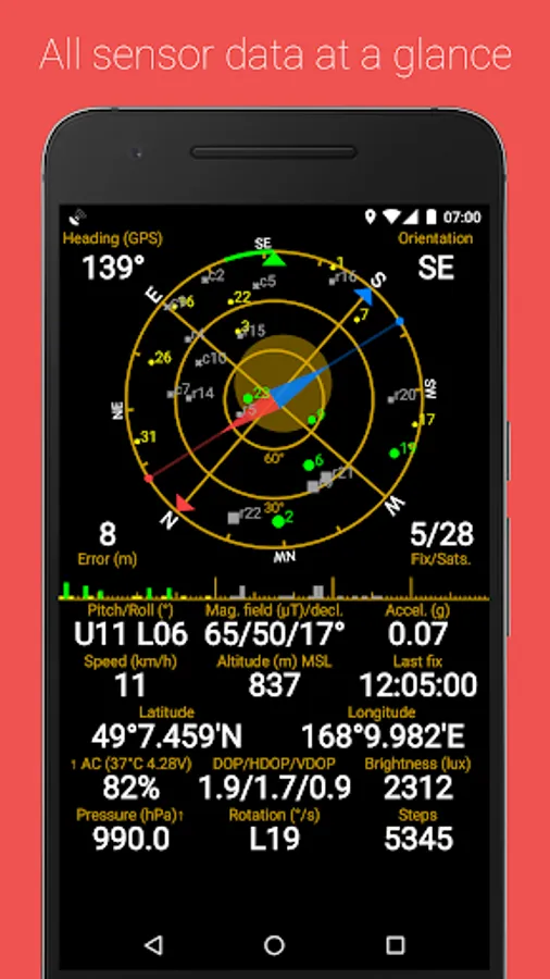 Displays all the GPS and sensor data you ever were curious about: position and signal strength of satellites, accuracy, speed, acceleration, altitude, bearing, pitch, roll and battery state.