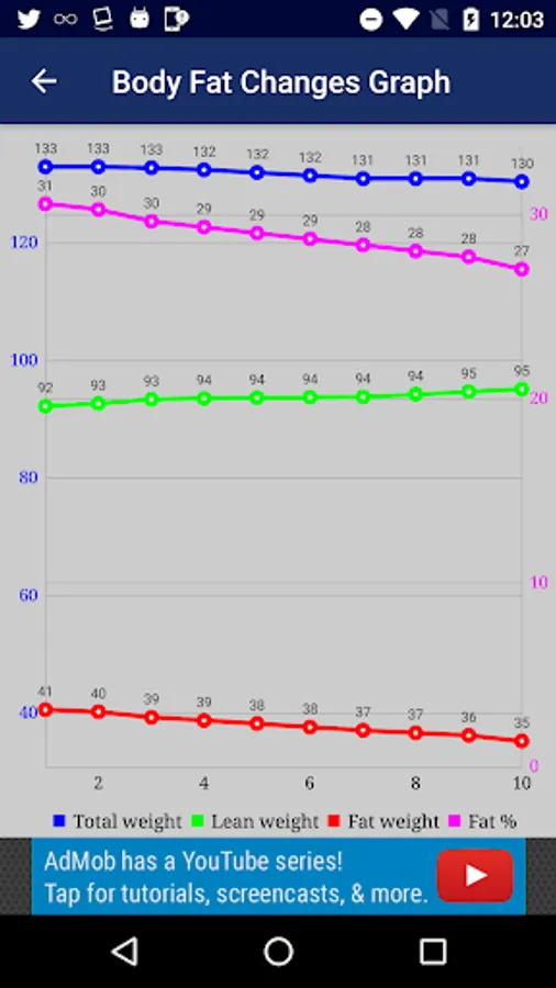 Track your weight and body composition changes in a colorful graph that shows you how your lean mass and fat mass have changed over time.