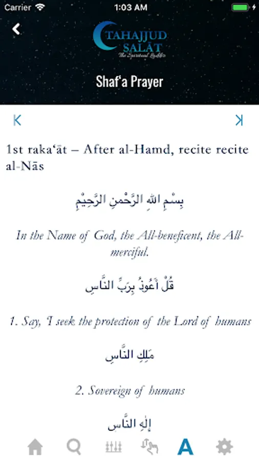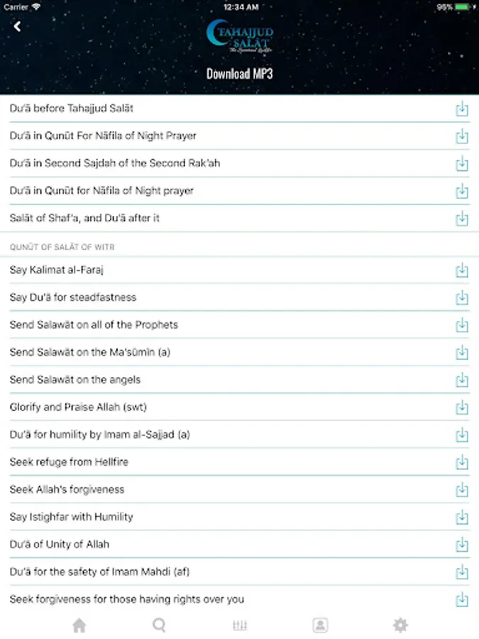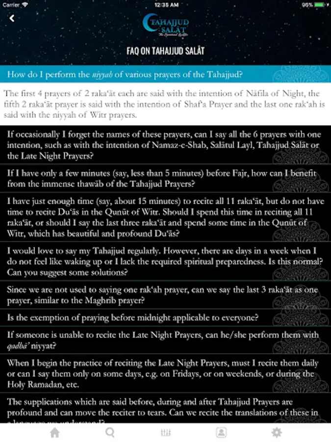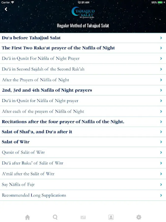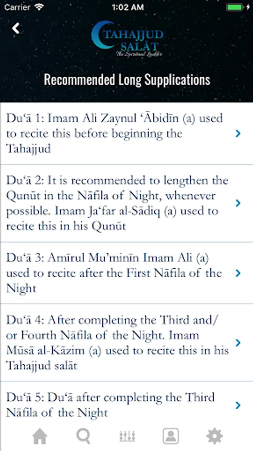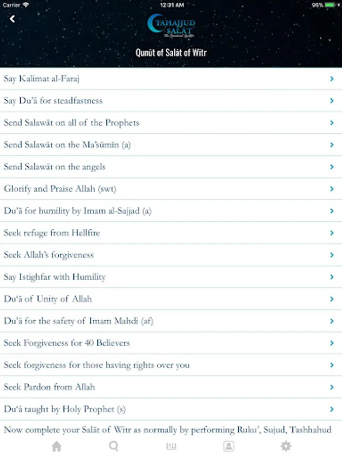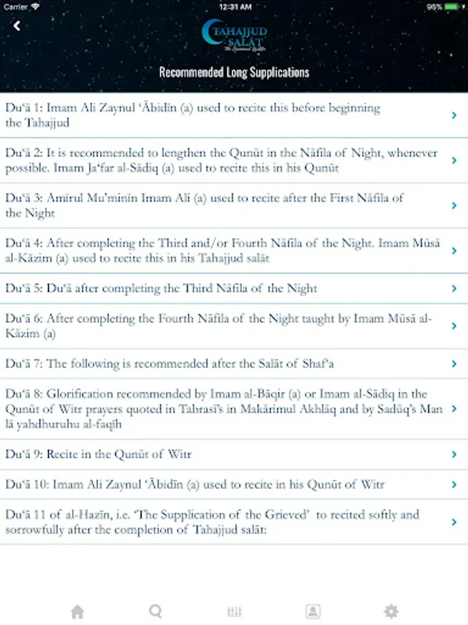 Tahajjud Salat: The Spiritual Ladder app contains the Arabic text of all recitations in the night prayer with line-by-line translation in English, which can be turned off easily for those wishing to only recite from the text. Glorifications and supplications from the Holy Prophet and his Ahlul Bayt are often inter-twined with Quranic passages. The translations of Quranic passages are clearly indicated in italics with references. The Qunut of Witr prayer has 17 beautiful recitations that heightens spirituality. Throughout the methodology of the prayer, the user is given an option to go to Longer Supplications if time permits. The 11 long supplications allows the servant to soar unto the Lord bring tears and humility.