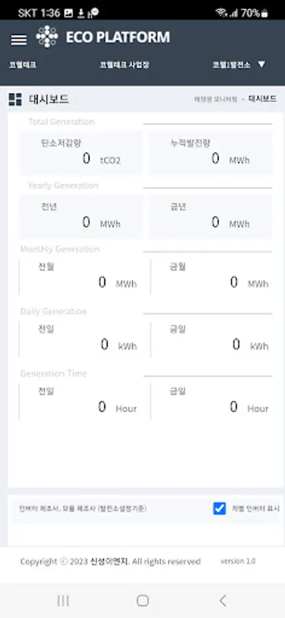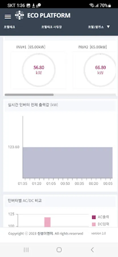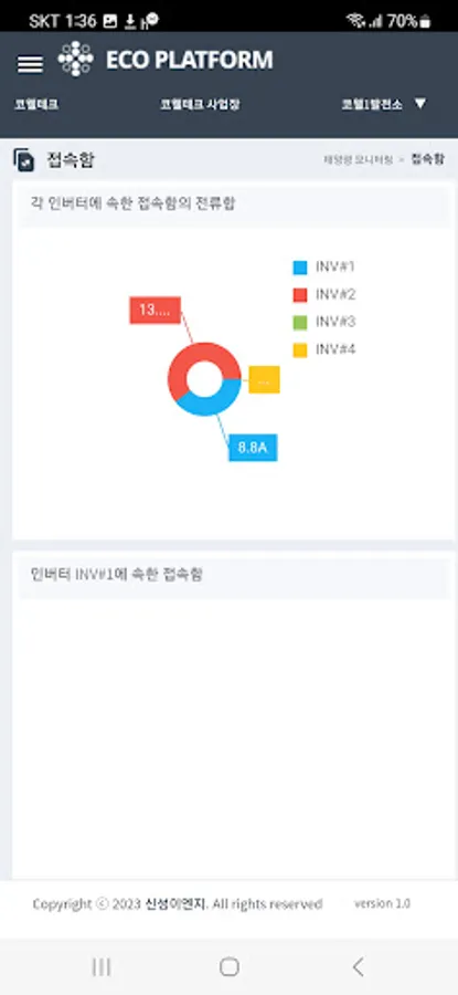 - 인버터별 현재 발전 전력, 전체 발전효율 및 변환효율을 확인할 수 있습니다.