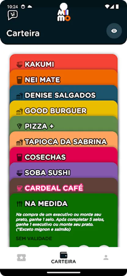 Tired of forgetting or losing your cards? Mimo has the solution! In it, you will find a place to handle your cards, simple and straightforward. More restaurants coming soon!