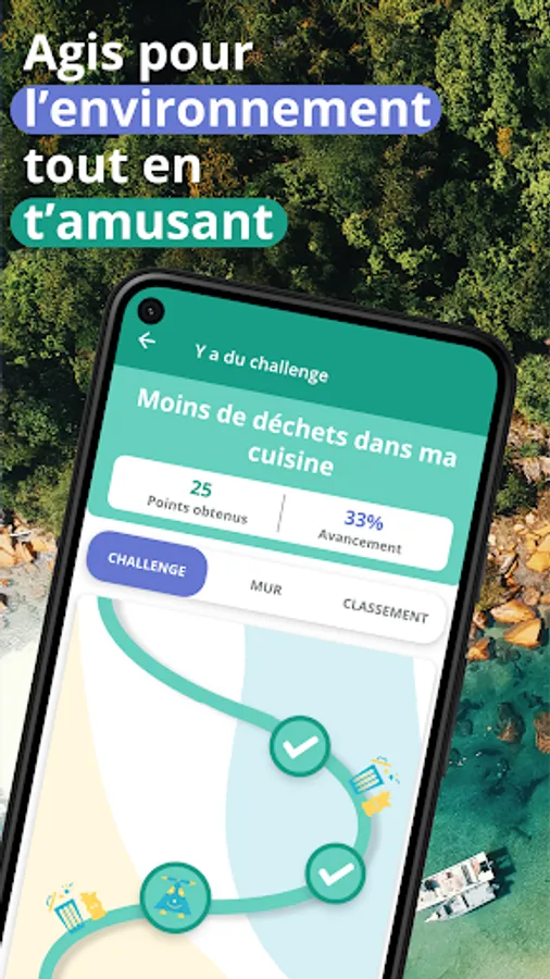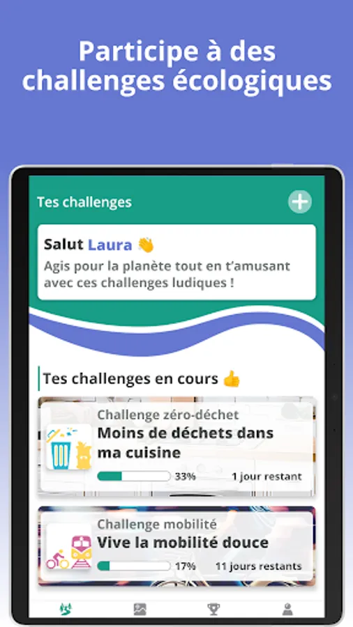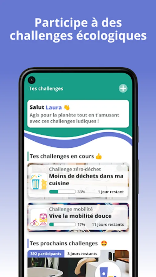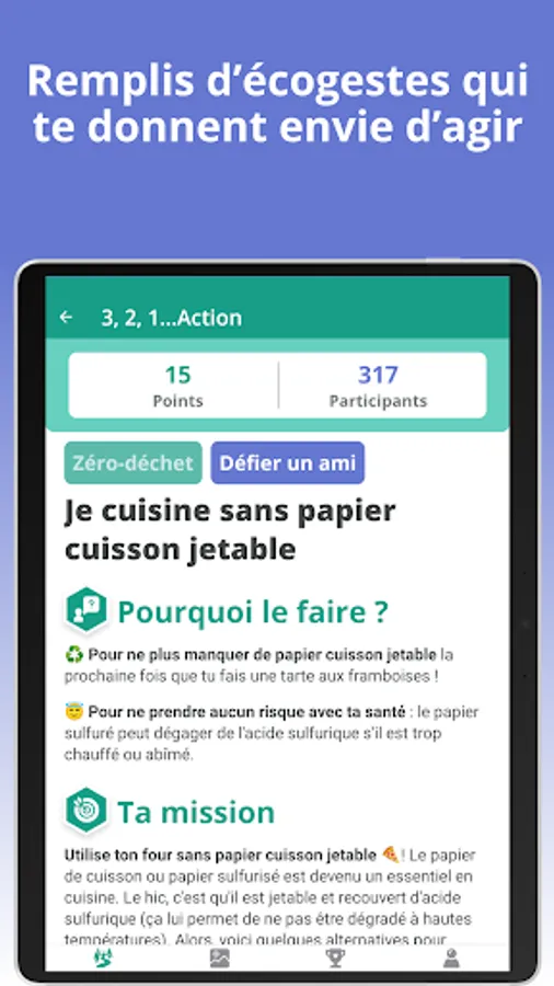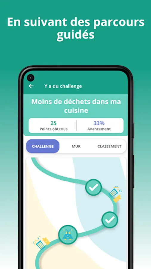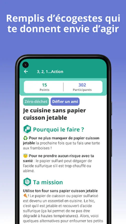 In each challenge, you will find a concentrate of eco-friendly habits and information presented as you go, in a logical and stimulating way! The challenges are built around a multitude of themes, such as zero waste, carbon emissions, water and energy savings ... You will inevitably find several challenges that will please you and motivate you to act. And every week, new challenges are offered to you!