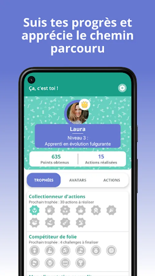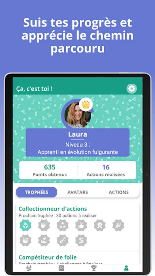 Appreciate the progress made by finding your trophies, your level, your avatar and your actions already carried out. You can even access your previous actions to find the information you are looking for!
