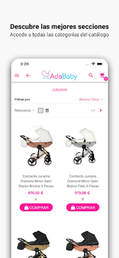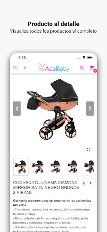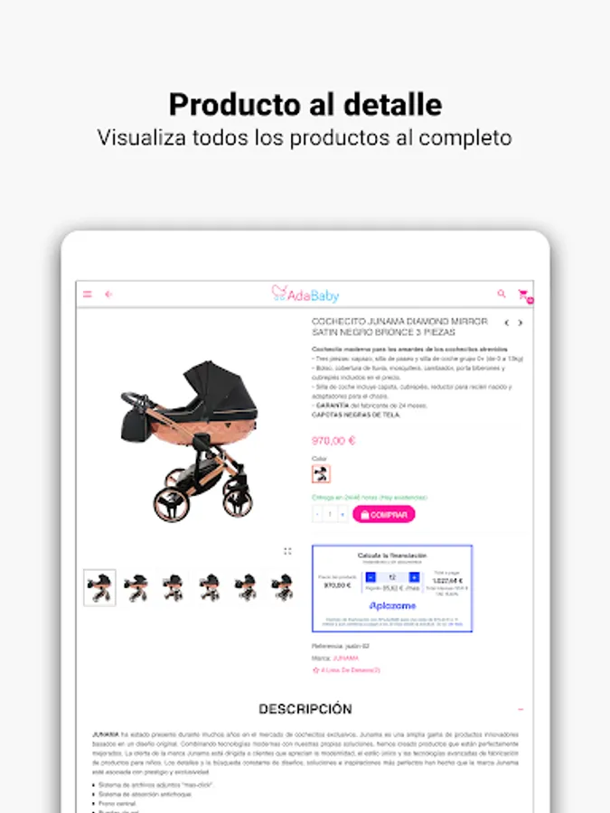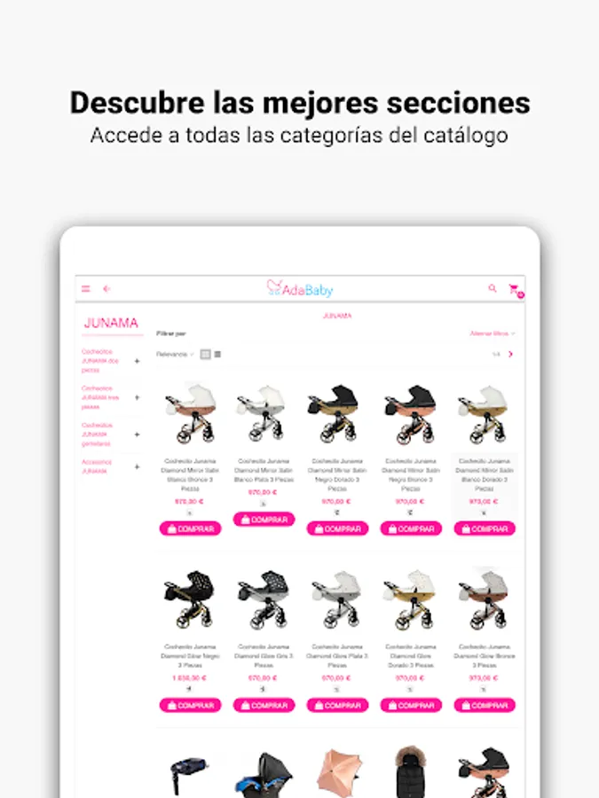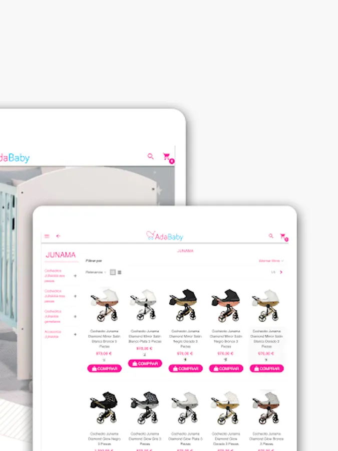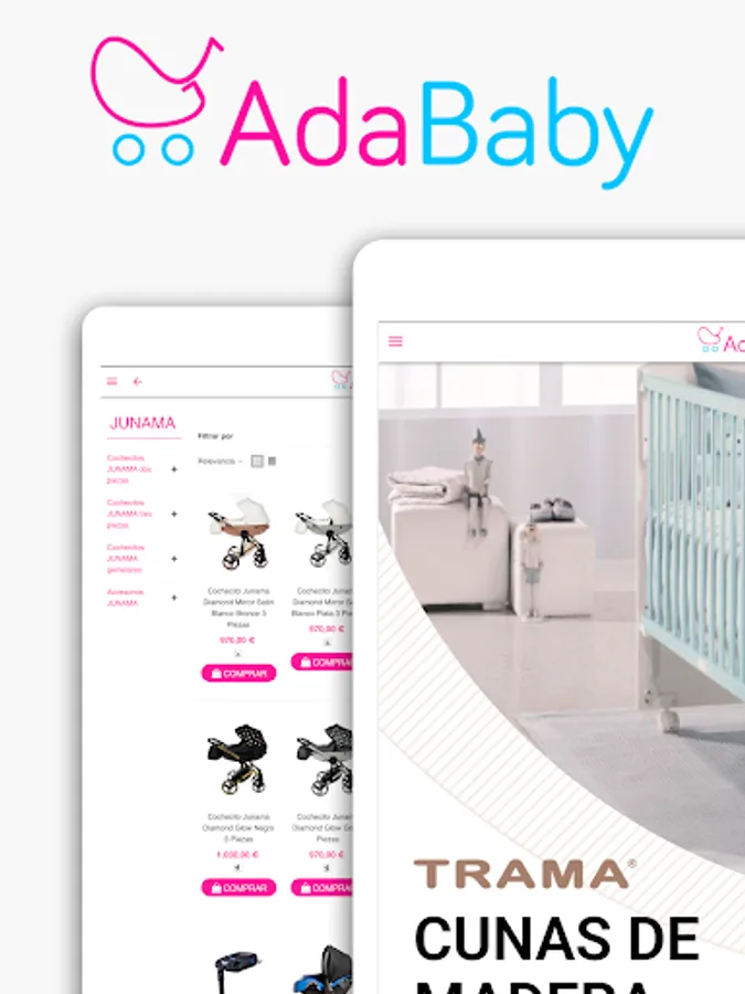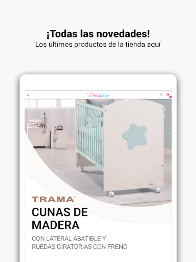 In the Adababy application you will find a wide selection of baby items and children's furniture. Well-known brands such as Cambrass, Chico, Concord, Babymonsters, Junama, Bebecar and many more with the best prices on the market.