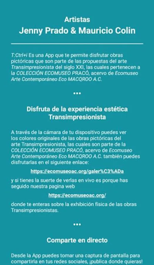T: Ctrl + i It is an App that allows you to enjoy pictorial works that are part of the proposals of Transimpressionist art of the 21st century, which belong to the ECOMUSEO PRACÓ COLLECTION, collection of Ecomuseo Arte Contemporáneo Eco MACQROO A.C.