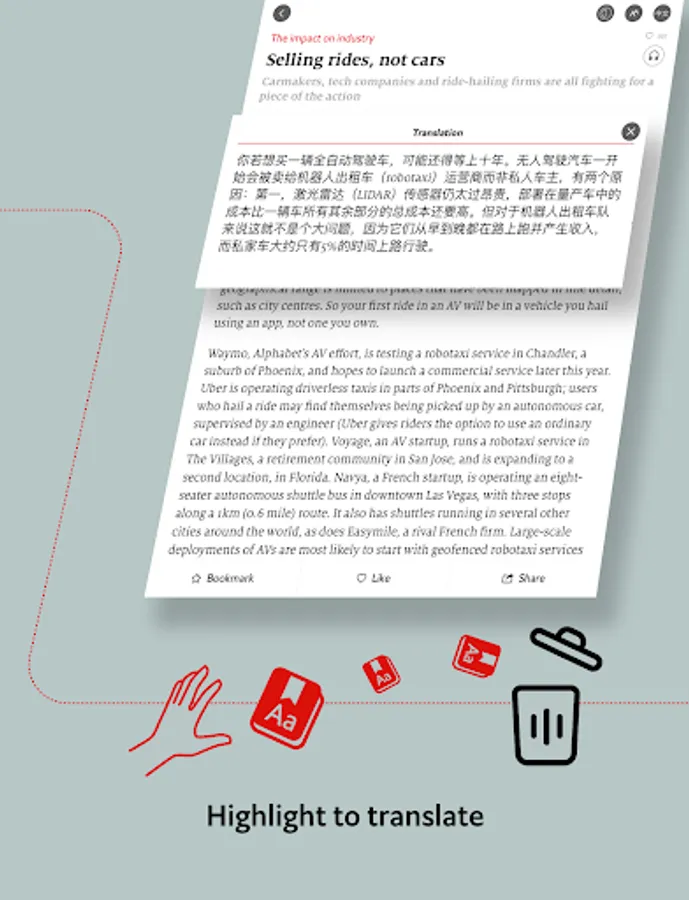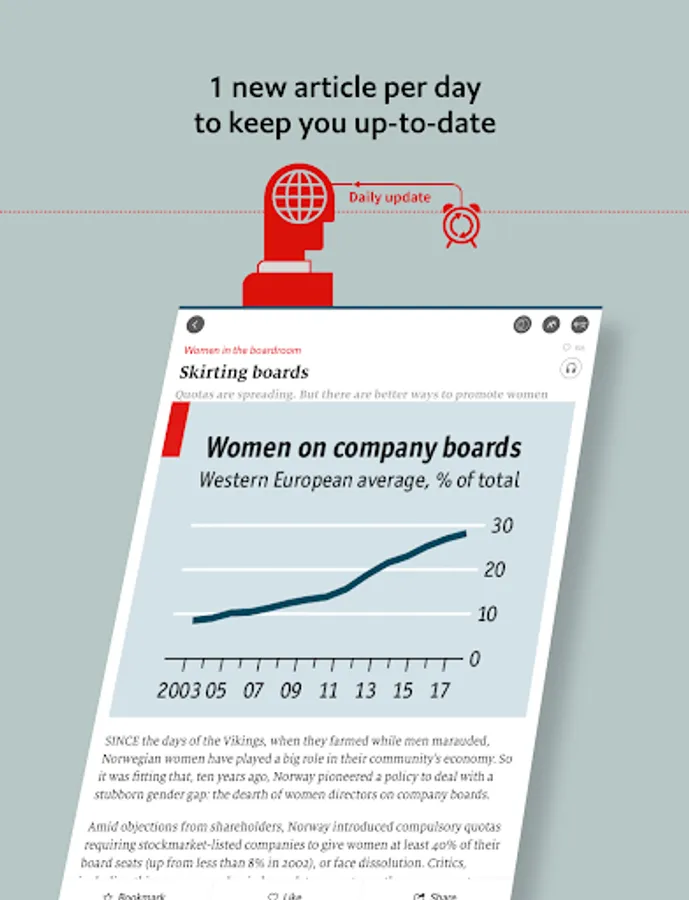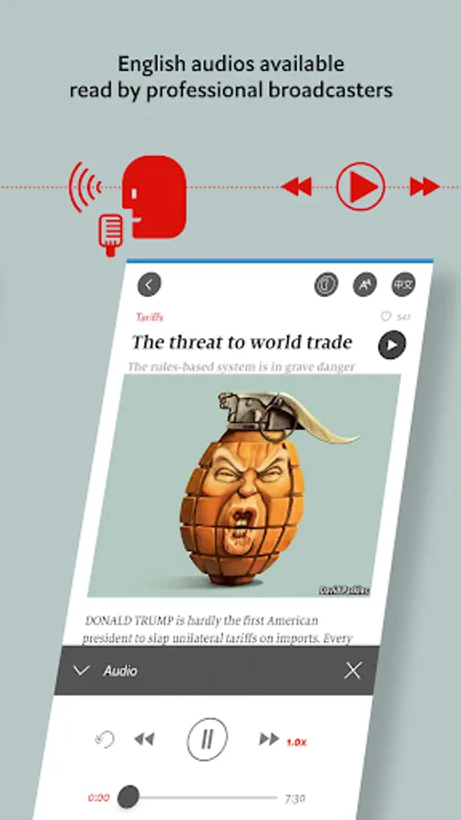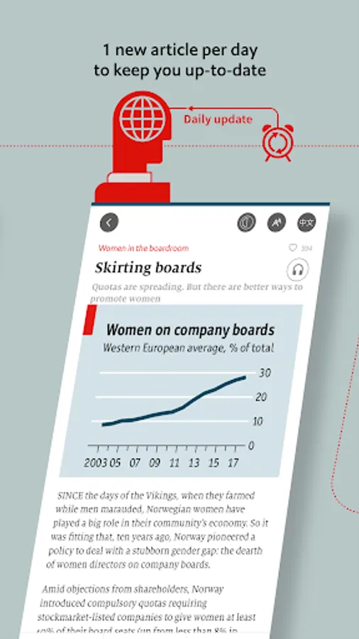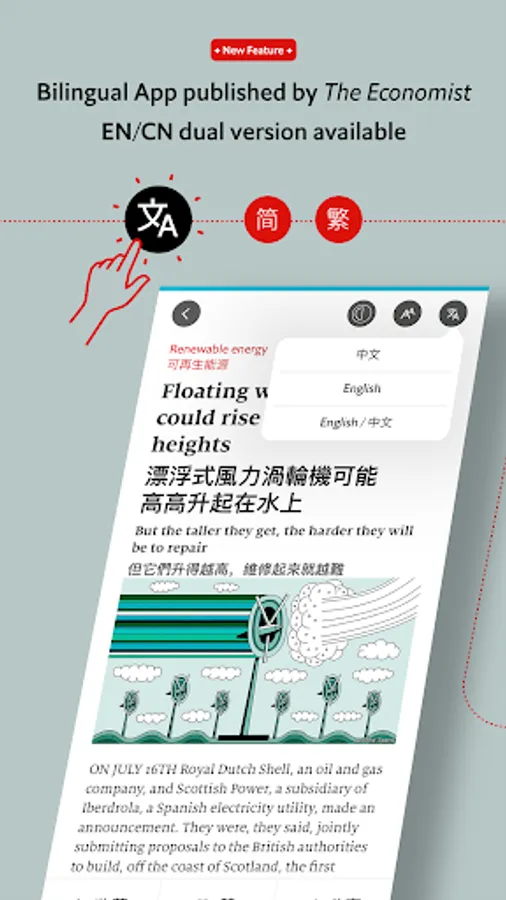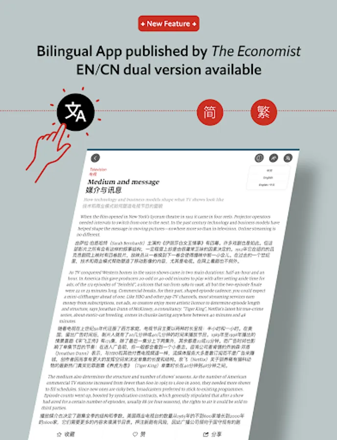 The Economist Global Business Review is a new bilingual digital app from the editors of The Economist Group. Each month, selected articles from business, finance and technology are translated, and delivered to your mobile device with an intuitive and attractive user interface. The articles will report on key trends shaping the global business community, always with the deep insight and sharp perspectives readers around the world have come to recognise from the Group.