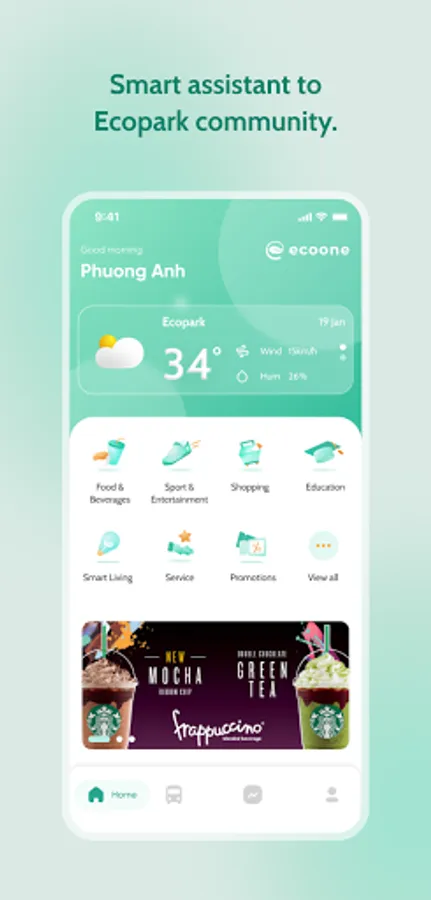 - Home Screen: Home screen plays a role as a smart information board to keep residents up-to-date with important and featured information at Ecopark. In addition, with a smart and friendly interface, the home screen makes it easy for visitors to find merchants, enhancing the experience of their stay at Ecopark.