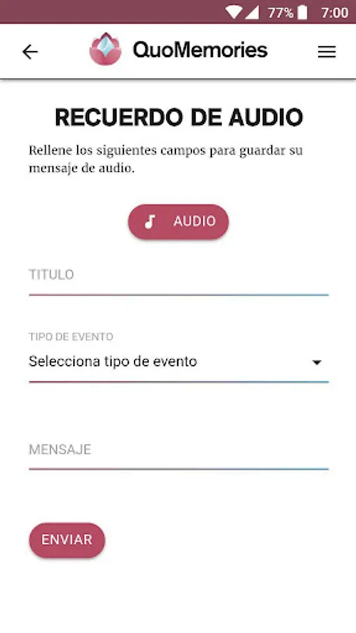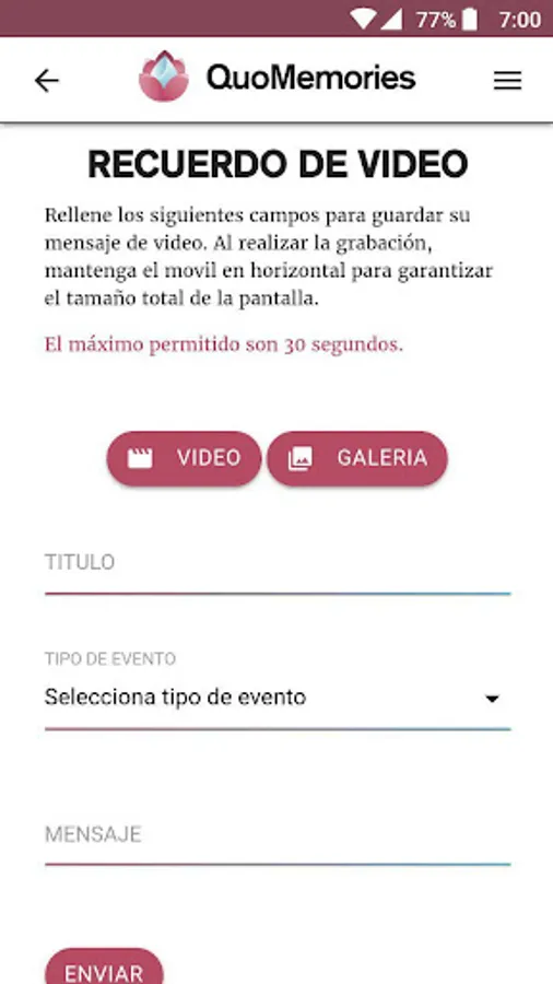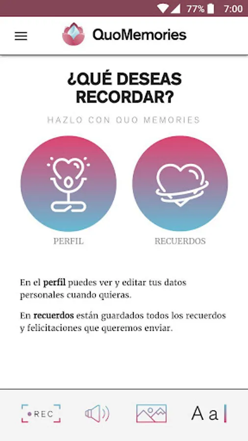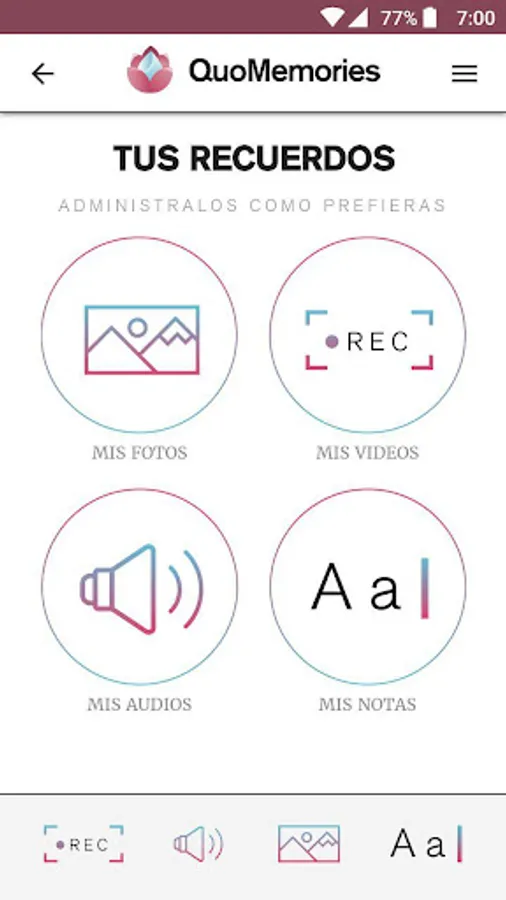 QuoMemories is an online platform that allows you to save and share digital memories in the form of image, video, text and audio. Its main objective is to make it easier for a user to save memories and program them or assign them to another user - it is not always necessary - to send them during any circumstance, either by personal choice (congratulation, birthday, indicated date ...) or by death (teach that user's digital storage after he or she has died)