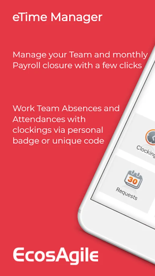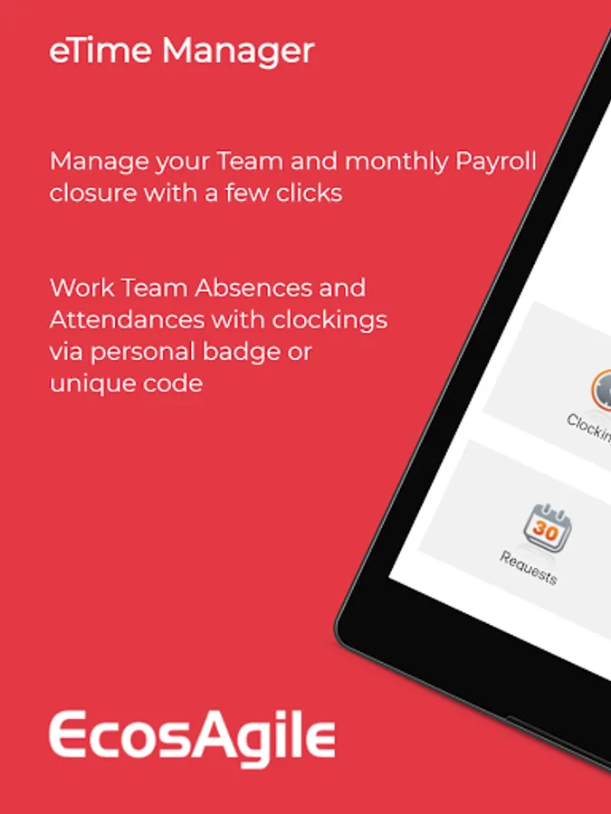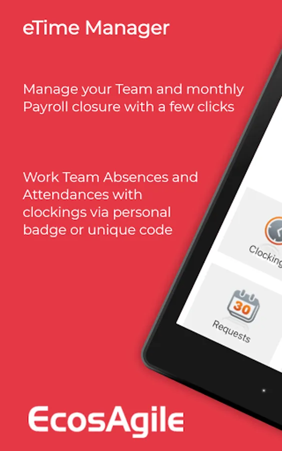 eTime Manager is a fully-fledged Time Management System that can manage personnel attendance in more than one working site for multiple working teams: clocking via tablet/smartlet, mobile app eTime or web, Ecosagile Cloud Software for absence requests management such as holidays, permits, illnesses, as well as overtimes and schedule planning.