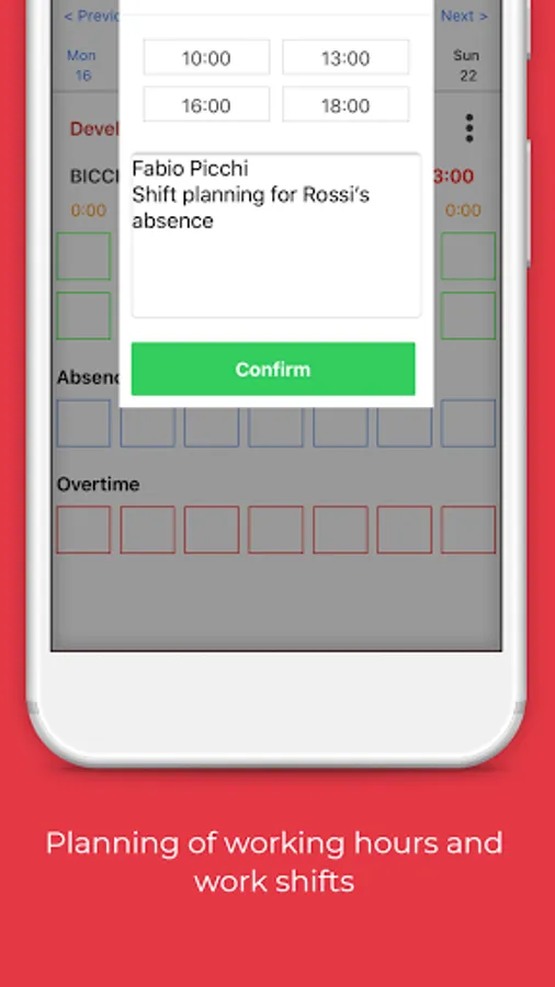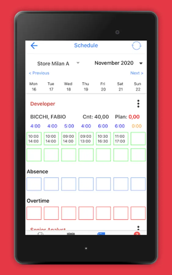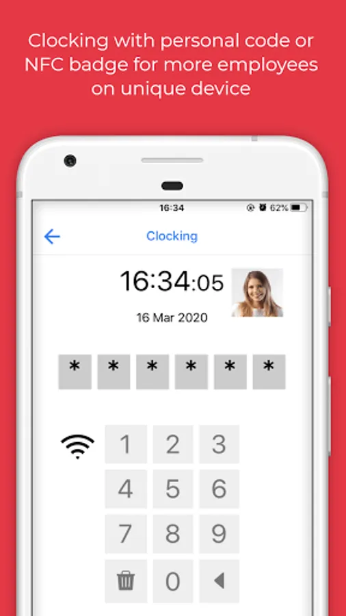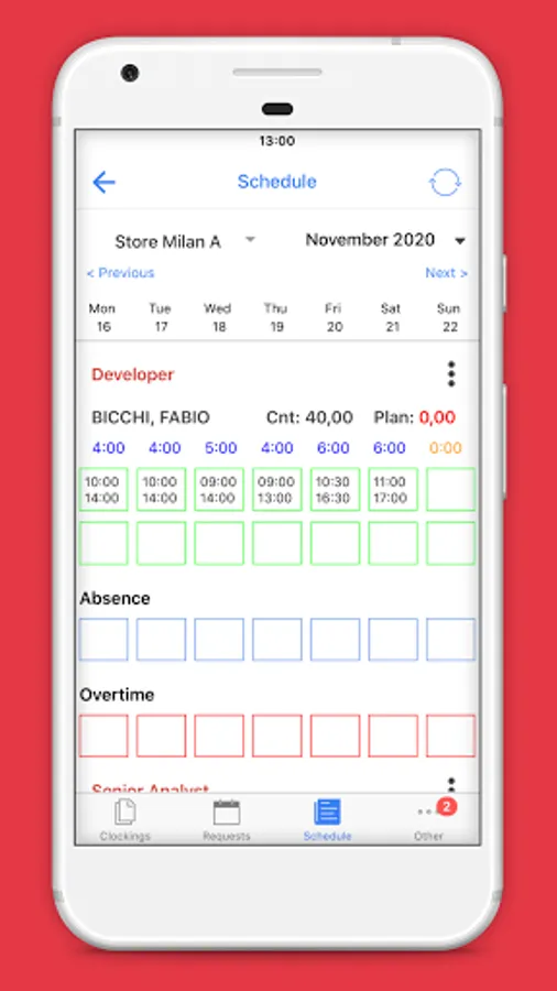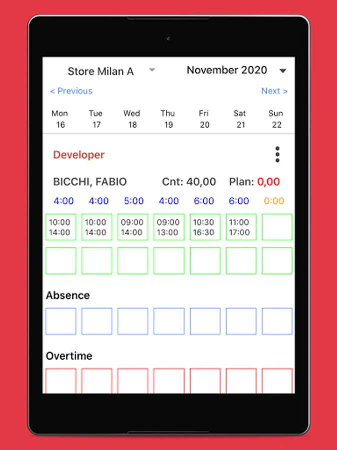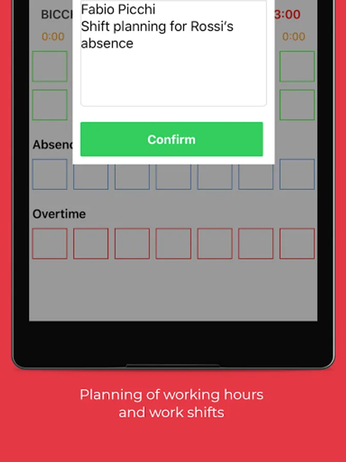 Manager has the technical capability to process clocking of his personnel via app that can be installed directly on the device; the team member simply has to digit a unique code to register clocking in or clocking out record; the manager himself can insert clockings, omitted clockings and register absence such as holidays, permits, sickness, accidents instead of his employees.