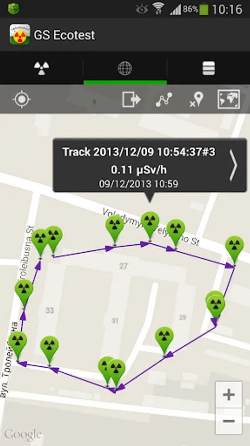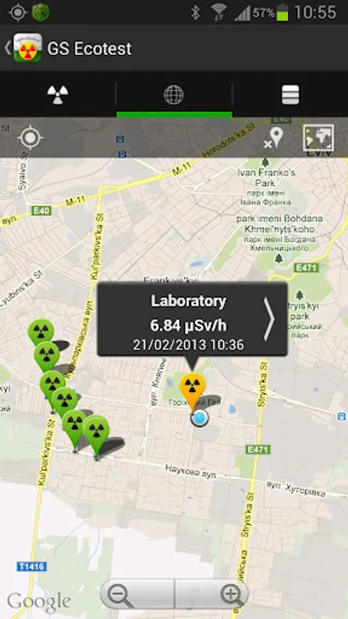 - dosimetric measurements exported in .kmz file for viewing on Google Earth and Google Maps, forwarding through the Internet and posting on social networks;