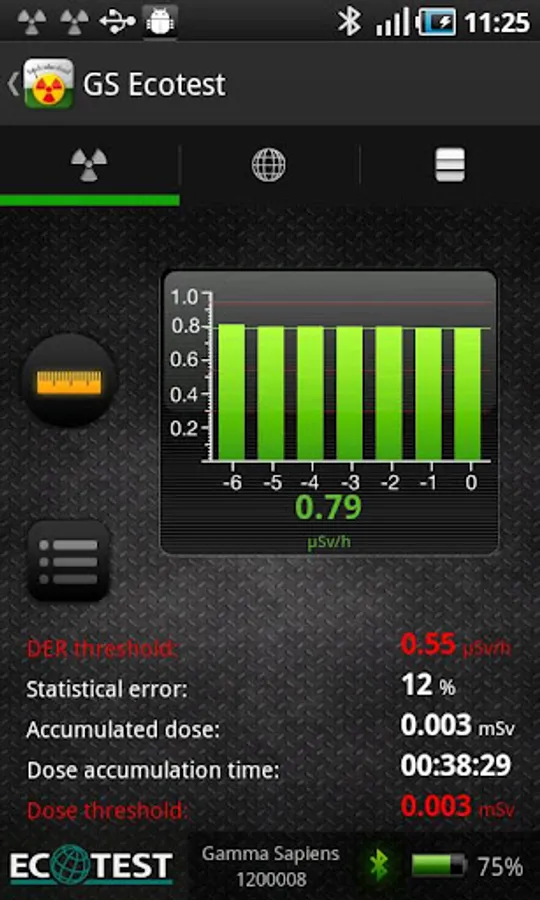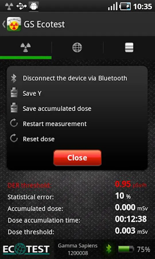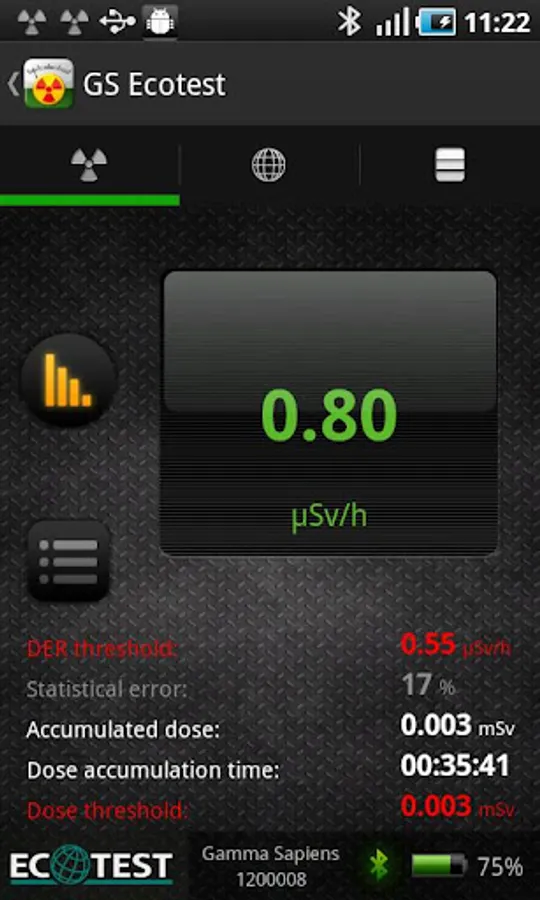 Measurement results are continuously transferred from “Gamma Sapiens” to “GS Ecotest” over the Bluetooth interface. Radiation measurements allow the operation of other smartphone features, such as making and receiving calls, sending and receiving SMS, setting up and using other applications.