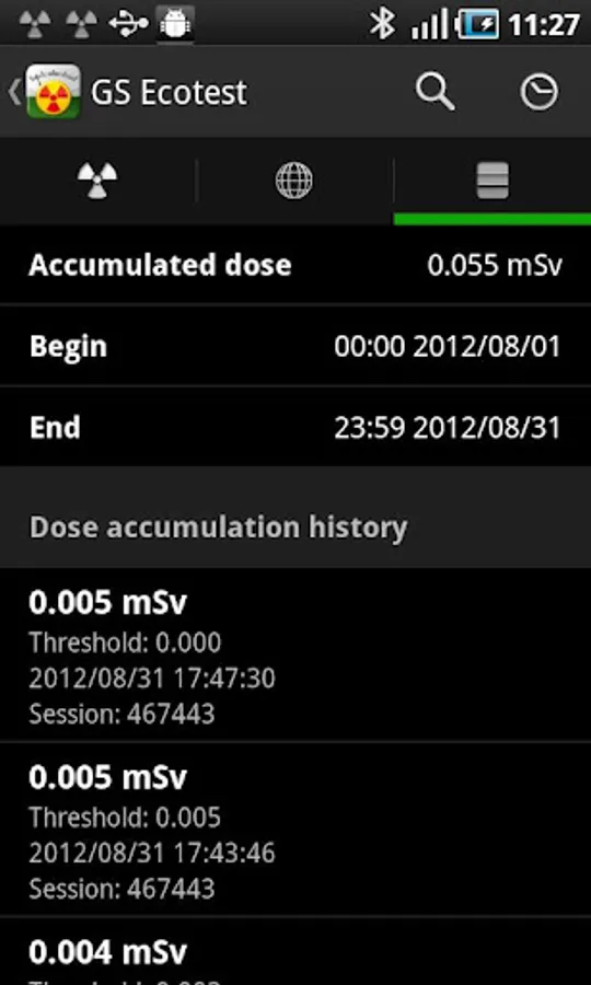- continuous flow of information about the radiation level and the accumulated dose from the “Gamma Sapiens” detector to the smartphone over the Bluetooth interface in real time;