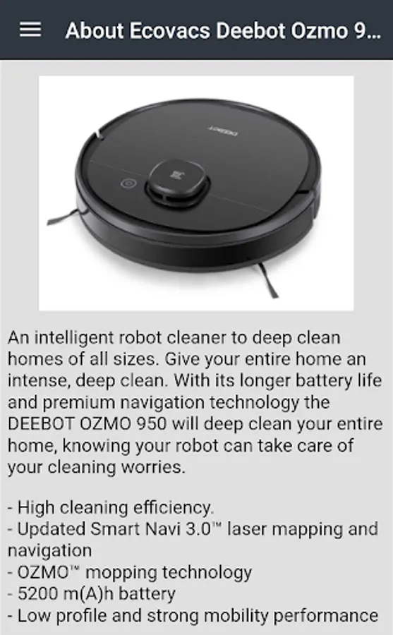 This app is a guide that should be at hand for anyone with Ecovacs Deebot Ozmo 950. It does not belong to an official brand.