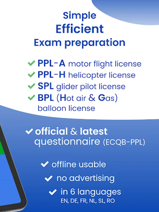 - Many private pilot licenses in one app: PPL-A, PPL-H, SPL and BPL(H) and BPL(G)