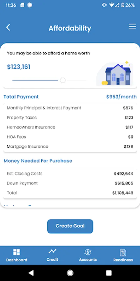 Life is one long series of credit journeys. Your LiftLocker will help you prepare for each of these journeys whether it is applying for a credit card, student loan, auto loan, or even a home loan. LiftLocker guides you through the homebuying process starting with budgeting for a down payment, building reserves for home ownership, building or improving your credit score, managing your debt-to-income ratio to make sure you can qualify for a mortgage. There is a calculator that helps you understand how much home you can realistically afford, and a readiness assessment tool that shows you the steps you need to take to be ready to apply and close on a mortgage.