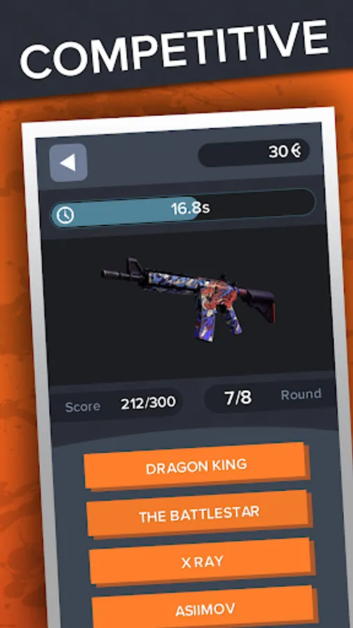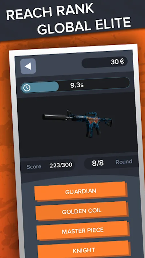 This mode will be unlocked if you complete at least 10 levels in Casual mode. In this mode, you have to select the right weapon skin name from 4 possible options. There is the target score for every game. If you choose the right name of the skin, you get the points. Be aware that, the faster you click the weapon, the more points you will earn.