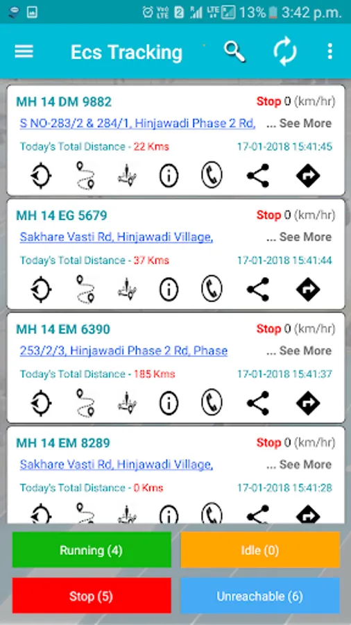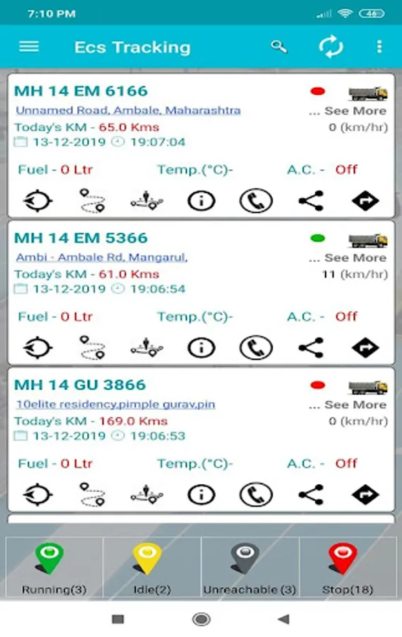 - Initially by default will see the star markers which indicates the current position alongwith their status(i.e moving/stop and so on) of all available vehicles.