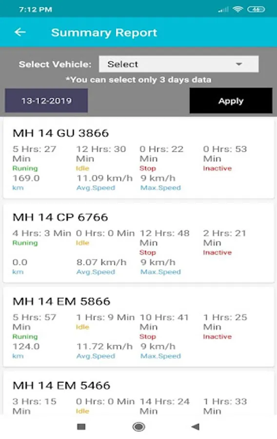 - Here you can see time, location, speed in dynamic tabular format of all vehicles or specific vehicleno with respect to date selection.