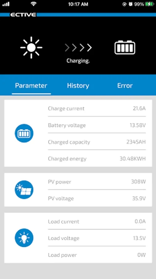 Through the Bluetooth module, APP can connect to the charger and display the working parameters, historical data, and error information of the charger in real time