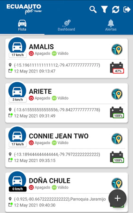 Exclusive monitoring application for ECUAAUTO Plus vehicles with GPS devices installed. App developed by Hunter