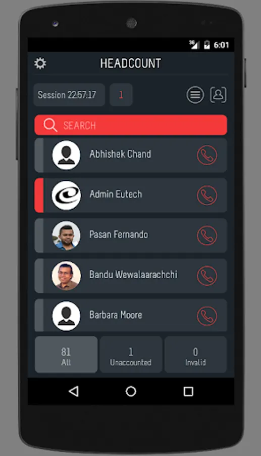 As each staff member is counted, app shows a countdown indicating a list of staff members ‘unaccounted for’ according to the day’s attendance records in the Access Card system of the building. App allows them to click-and-call missing staff members, if necessary.