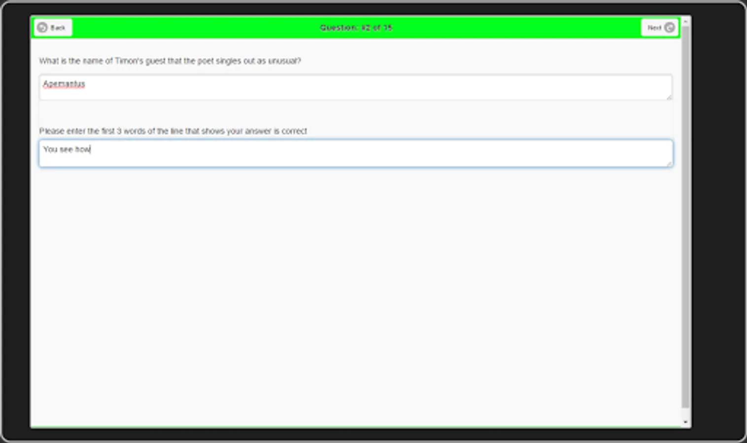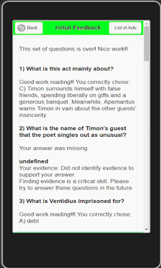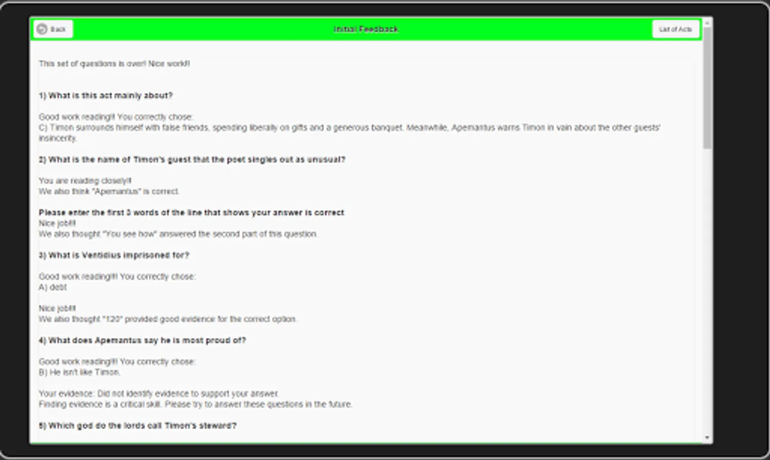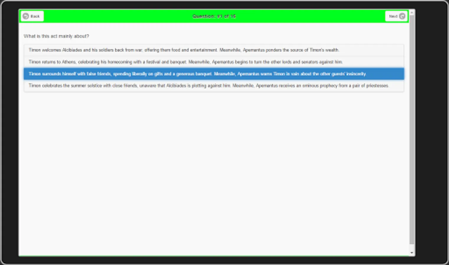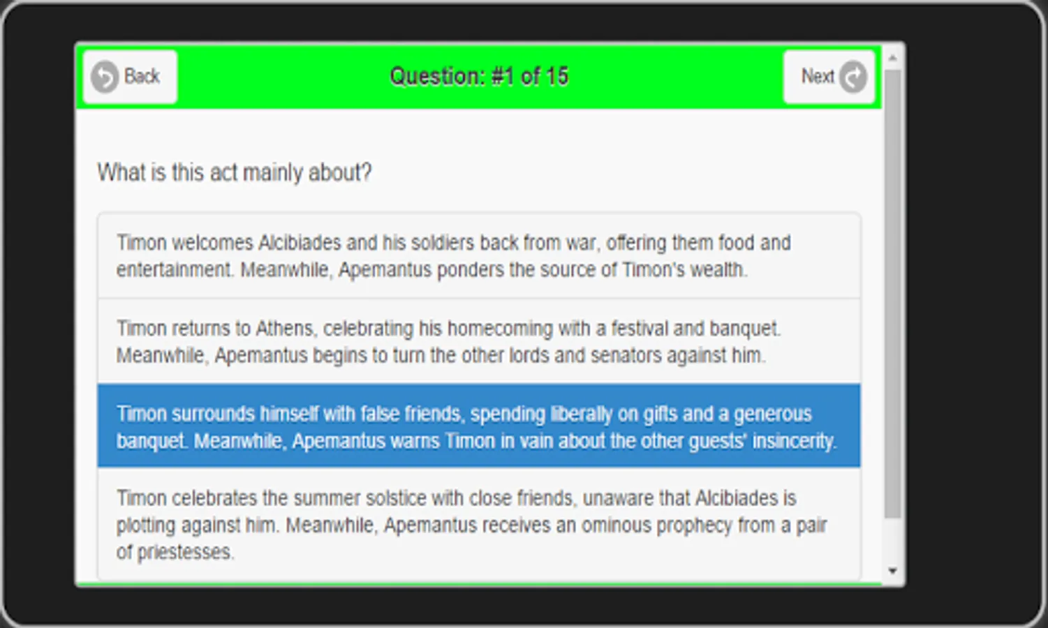 We help your student better understand Timon of Athens. edMe Reading Companion apps use proven reading instruction to help your student get the most out of the books and play they choose to read. This app asks students questions that reinforce the main idea of each chapter as well as important details for understanding Timon of Athens. The themes are carefully curated so that students understand the violence and motivations in this book.
