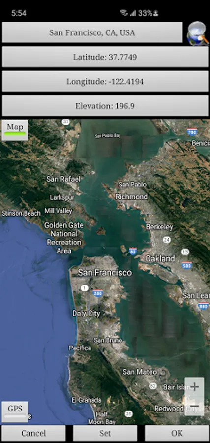 •Map Input - Use the map to zoom and pan to a location. Pressing the Set button sets the location name, coordinates and elevation in the text boxes. The elevation of the current coordinates is retrieved using the specified elevation data source setting. Switch between map and satellite modes by toggling the Map/Sat button.