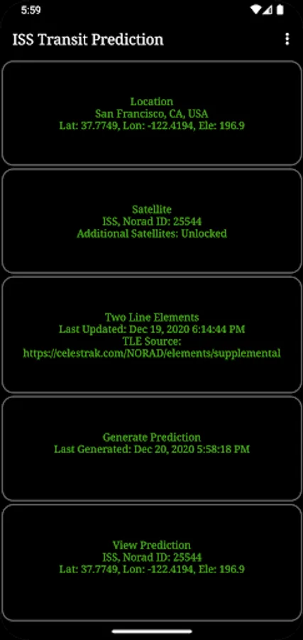 Pro Version Only: Specify and save multiple locations, Save multiple prediction maps for later viewing, add transit to Calendar, View maps with Google Earth, User specified Two Line Elements. No Ads.