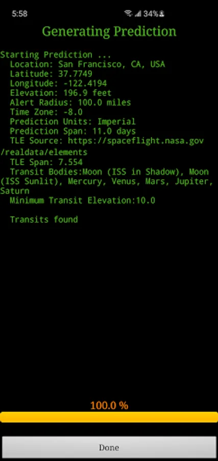 The user specifies a location, which includes latitude, longitude and elevation. The application downloads the latest orbital information. The application generates a transit prediction map which contains prediction paths for each transit within a specified alert radius.