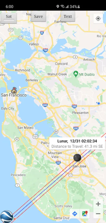 Once the prediction generation is complete, the prediction map or text file can be viewed. Pressing the View Prediction button brings up the previously generated prediction map. The text button within the map view displays the prediction text. The Map/Sat button switches between Map mode and Satellite mode.