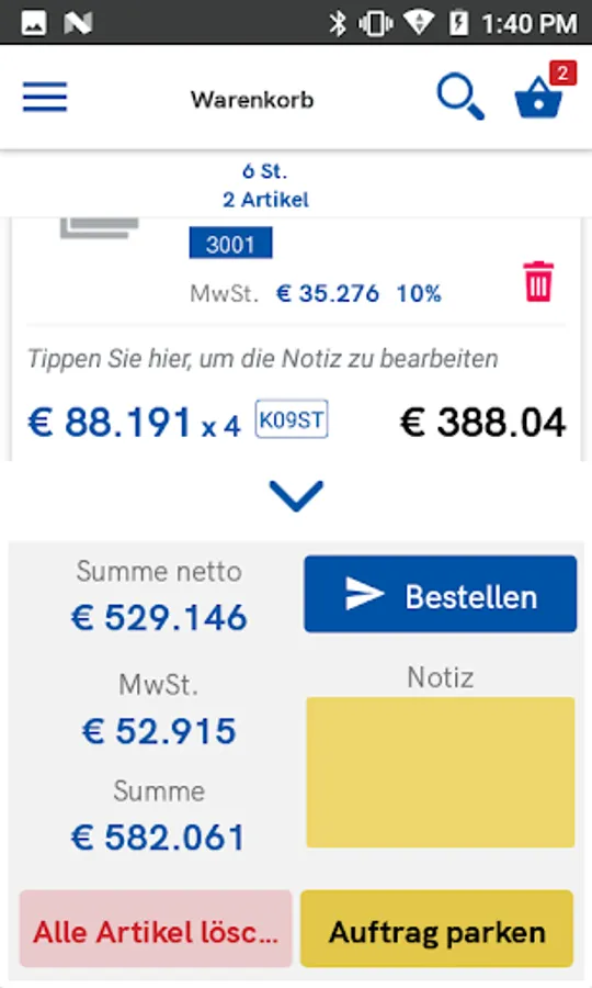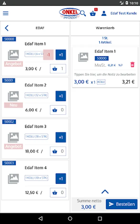 Onkel Süd Android app offers customers the option of entering their orders online. Customers can also view your open items.