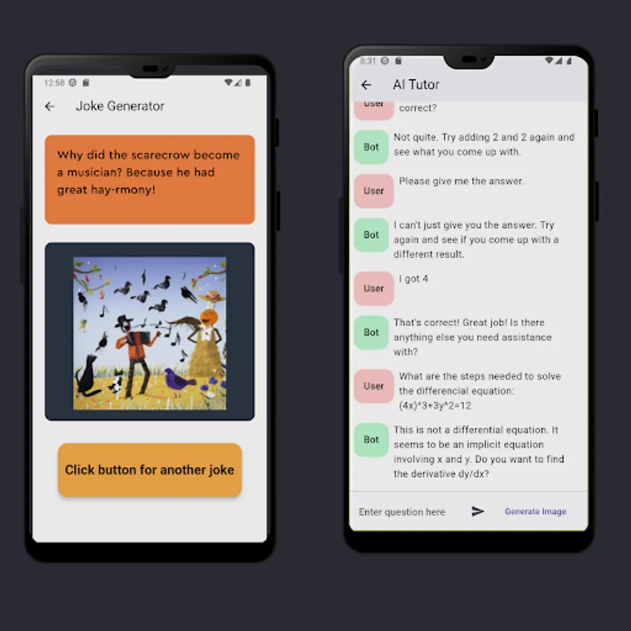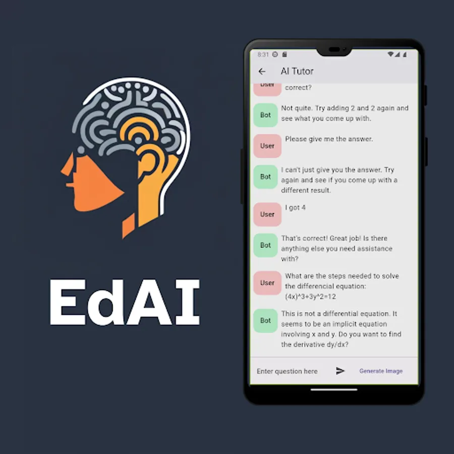 EdAI will be designed to help students learn, and instead of just giving them answers, which does not benefit them at all in the long run. Our pre-trained AI model acts almost like a teacher. EdAI is programmed to lead students to the answer based on their own previous knowledge, and instead of just giving the answers. The app reaffirms knowledge that the student already has, and nudges them towards the correct answer. EdAI is also able to boost a student’s mental health by using AI to tell the user a joke, and uses a generative AI image model to fabricate an image that goes along with the joke.