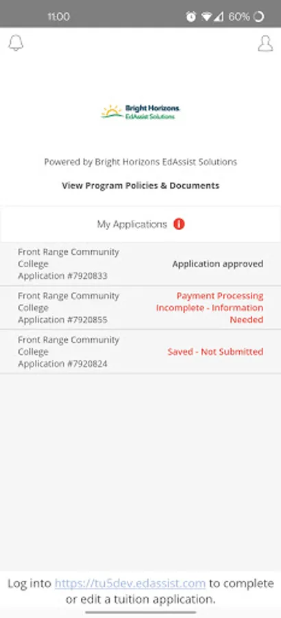 Use this app to track the status of applications created on the EdAssist Solutions website and upload documentation for Workforce Education payments under your employer's benefits plan.