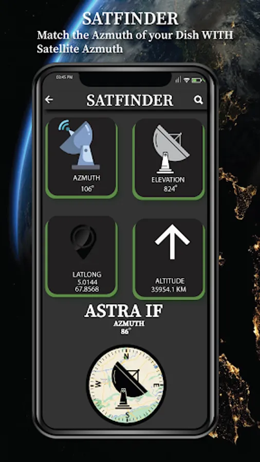 2. Click the Satellite Finder Button, then the Satellite Name, and finally the Search field to select the required Satellite. A list of satellites will emerge, from which you can choose the one you want. You'll obtain the azimuth of your chosen satellite along with your location's latitude and longitude.