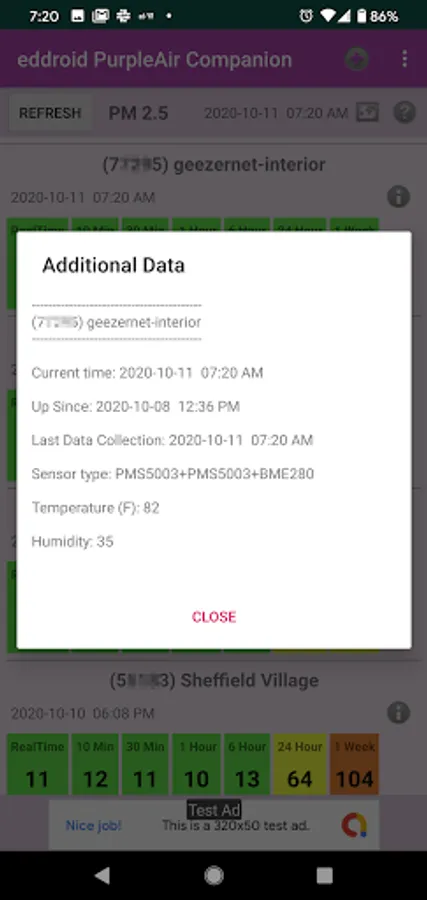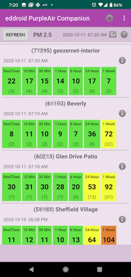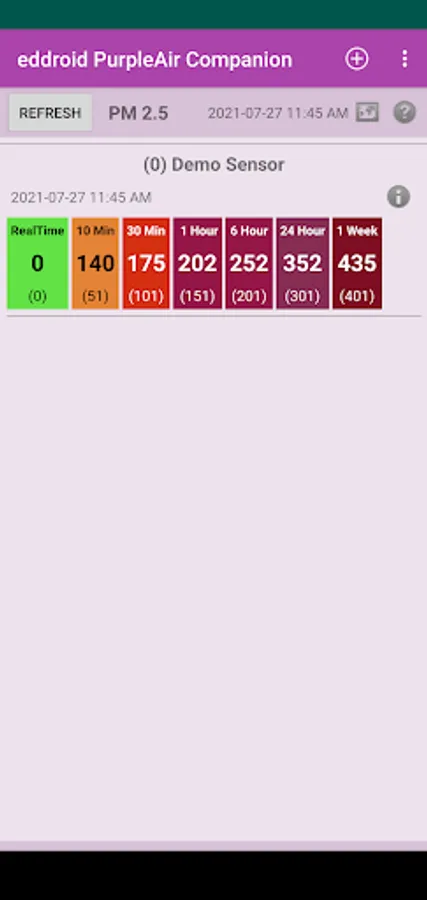 See the PM2.5 statistics (real time, 10 minute,... 1 week) provided by each sensor as raw measures mapped to AQI, as well as additional data from each sensor such as uptime, temperature, humidity. Refresh on-demand.