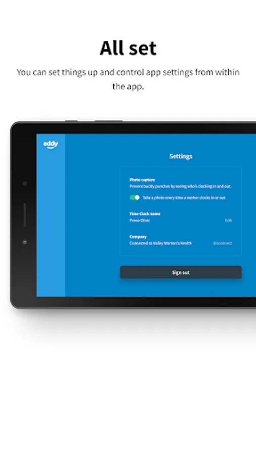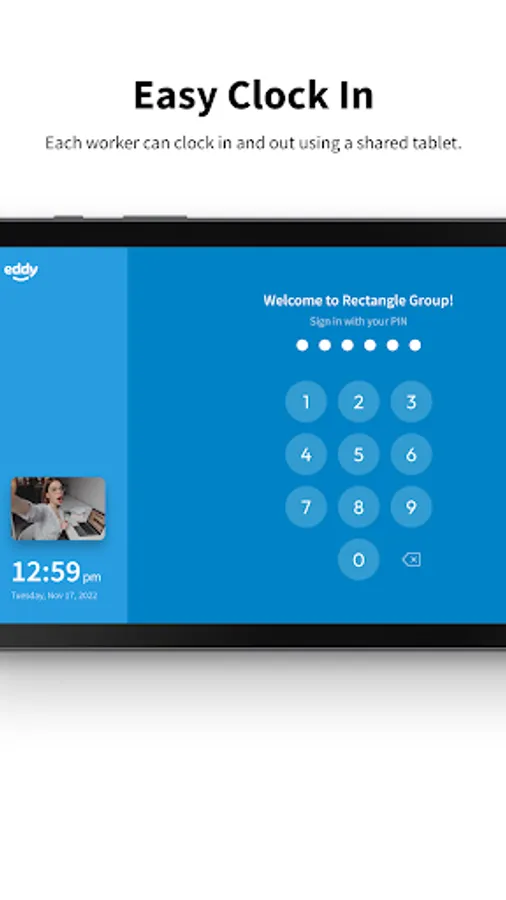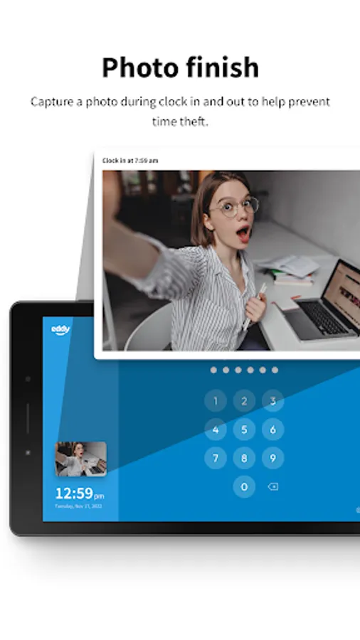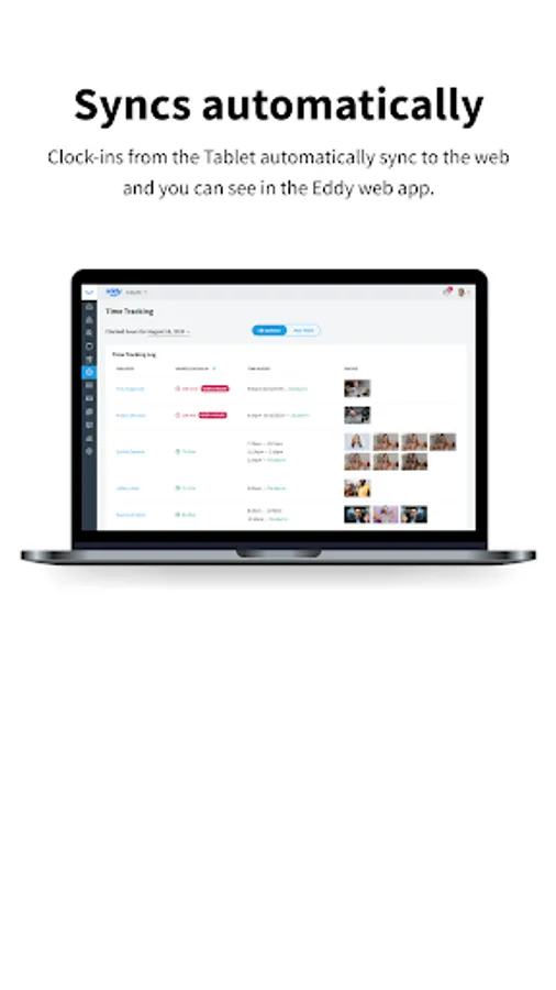 Eddy's Tablet Time Clock app is for companies who have employees to clock in and out using a central time clock. Your workers are each assigned a unique PIN code. The app can even take a photo of each person during clock in to help you prevent time theft. Time blocks automatically sync with your Eddy account. Requires an internet connection.