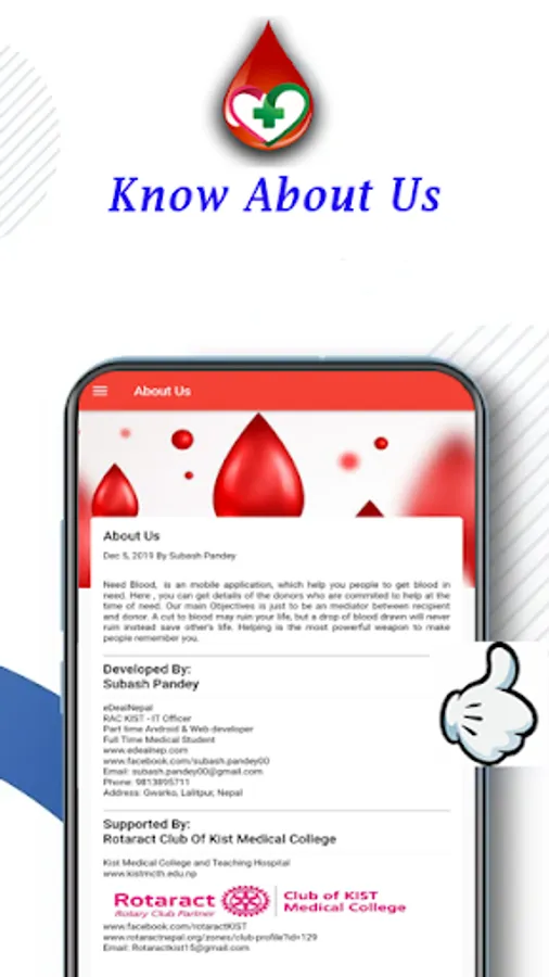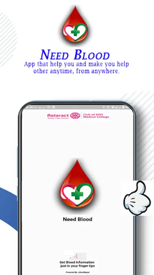 Need Blood App, is the program initiated by Student of Kist Medical College and Teaching Hospital, Imadol, Lalitpur, Nepal in collaboration with Rotaract Club of Kist Medical College. The main objective of our application is to make people easy to find the blood donors when needed and in case of emergency.