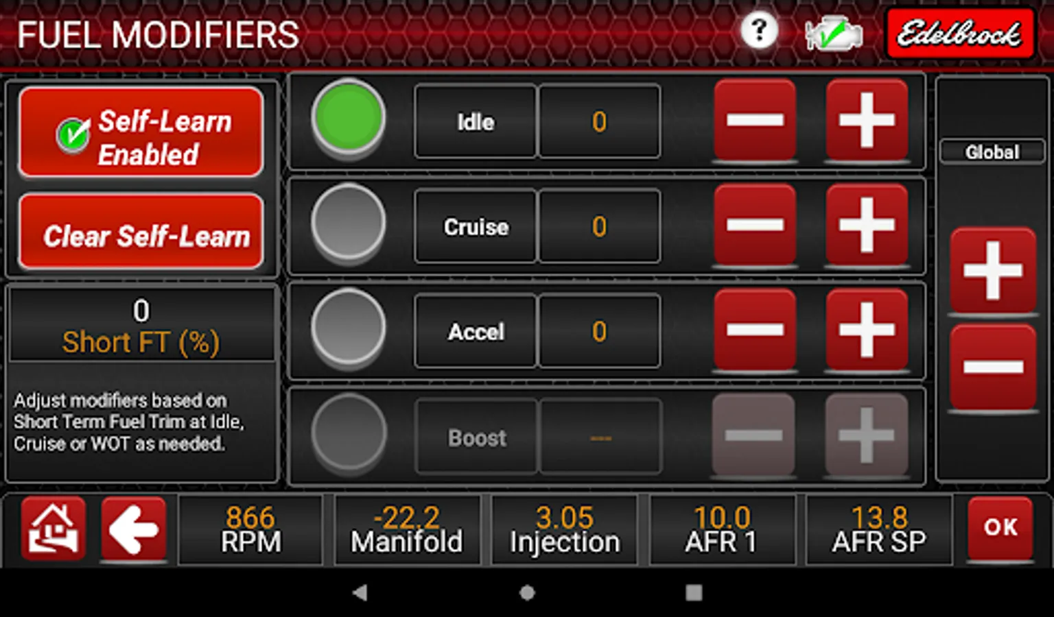 • User-adjustable fueling modifiers for idle, cruise and acceleration (WOT)
