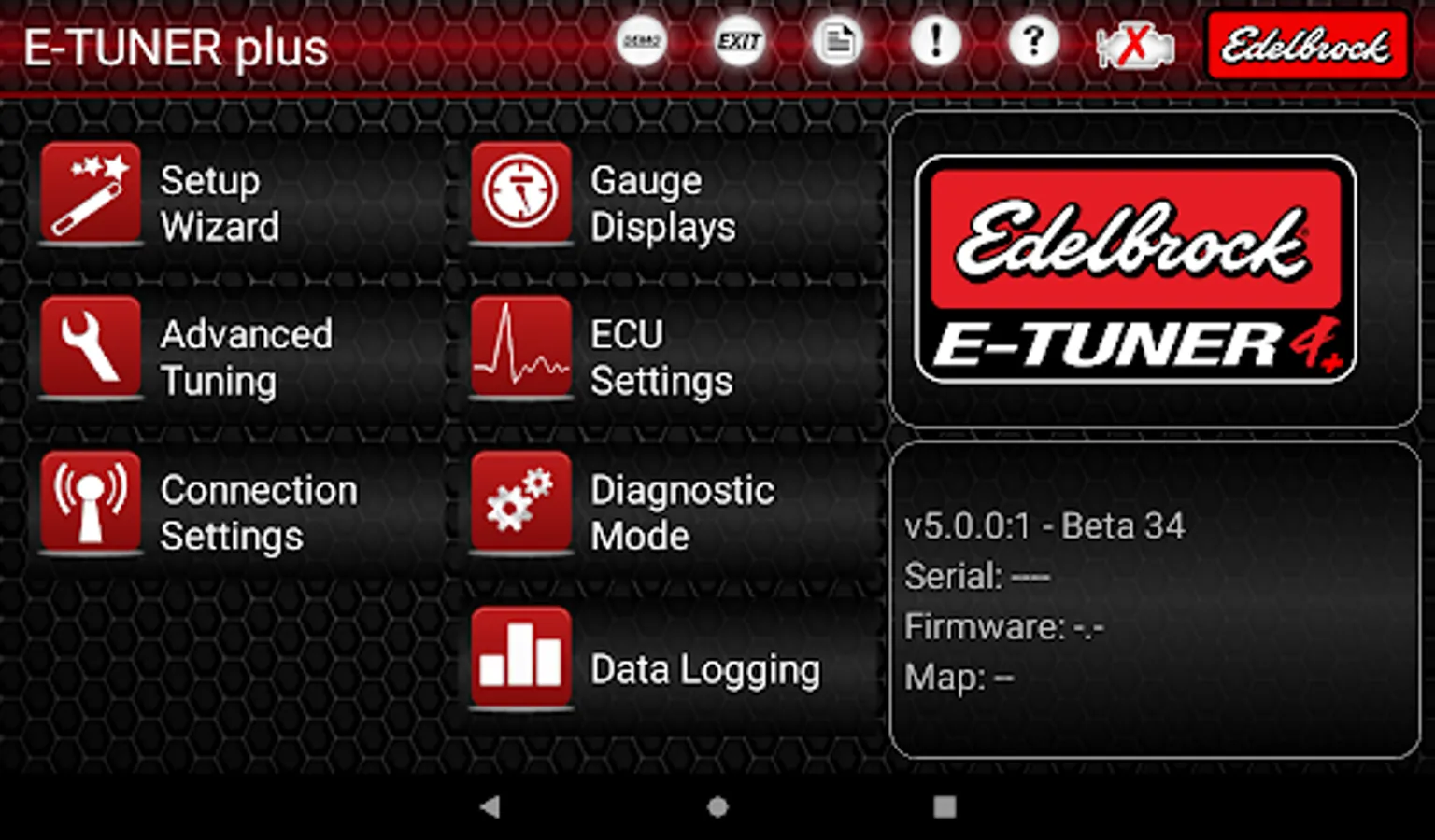 You can also preview E-Tuner 4 Plus without being connected to an Edelbrock EFI System by enabling "Demo Mode." This will allow you to access the app's main features, and interact with pages like the Setup Wizard, Advanced Tuning, and Gauge Displays to get a feel for how E-Tuner 4 Plus functions.