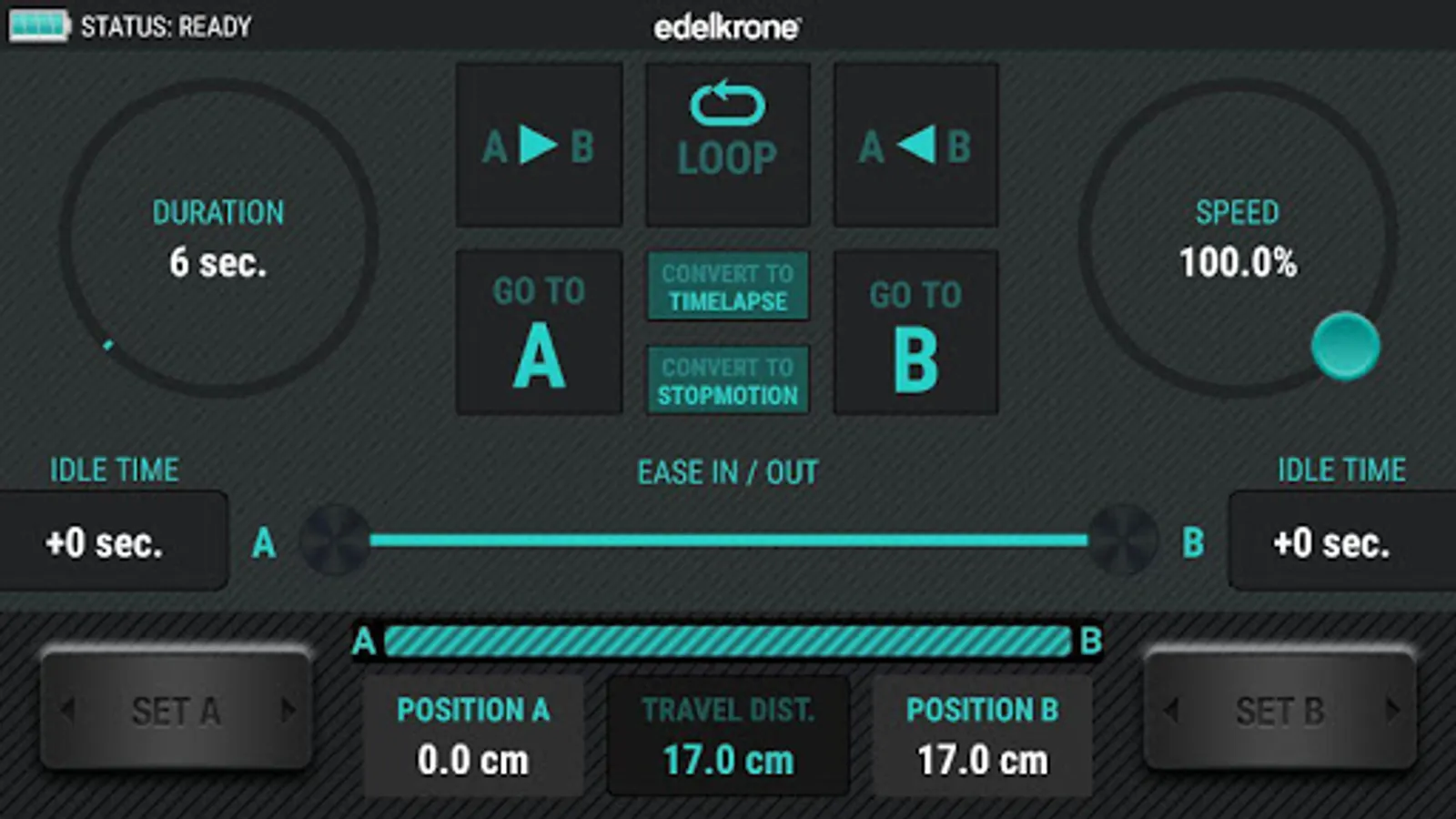 Motion Module App for edelkrone's SliderONE: Bluetooth connected, mobile app controlled single axis motion controller for precise slide, time-lapse, stop motion, and macro filming.