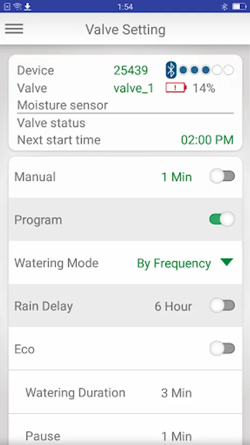 •Manual settings from the App is simple task (Manual watering in 1 minute increments up to 360 minutes)