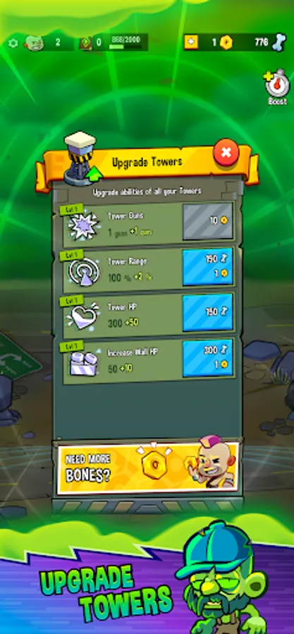 To keep pace with the ever-increasing zombie menace, your towers can be upgraded with a variety of enhancements. Equip your towers with special types of guns, including sniper rifles, machine guns, and bombs, to ensure you're always ready for whatever the zombie horde throws at you.