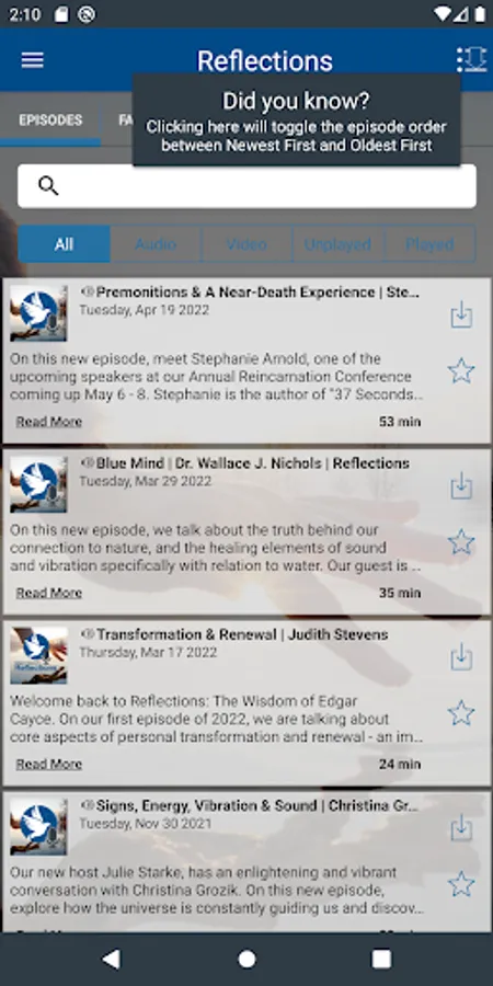 This is the most convenient way to access Edgar Cayce's Reflections on your phone. With this app you are always connected to the latest episodes and the show. You can also star your favorite episodes and save them to a list so you can easily enjoy them over and over! This app gives you complete access to our Reflections Podcast and if you're a fan of the show you won't want to be without it!