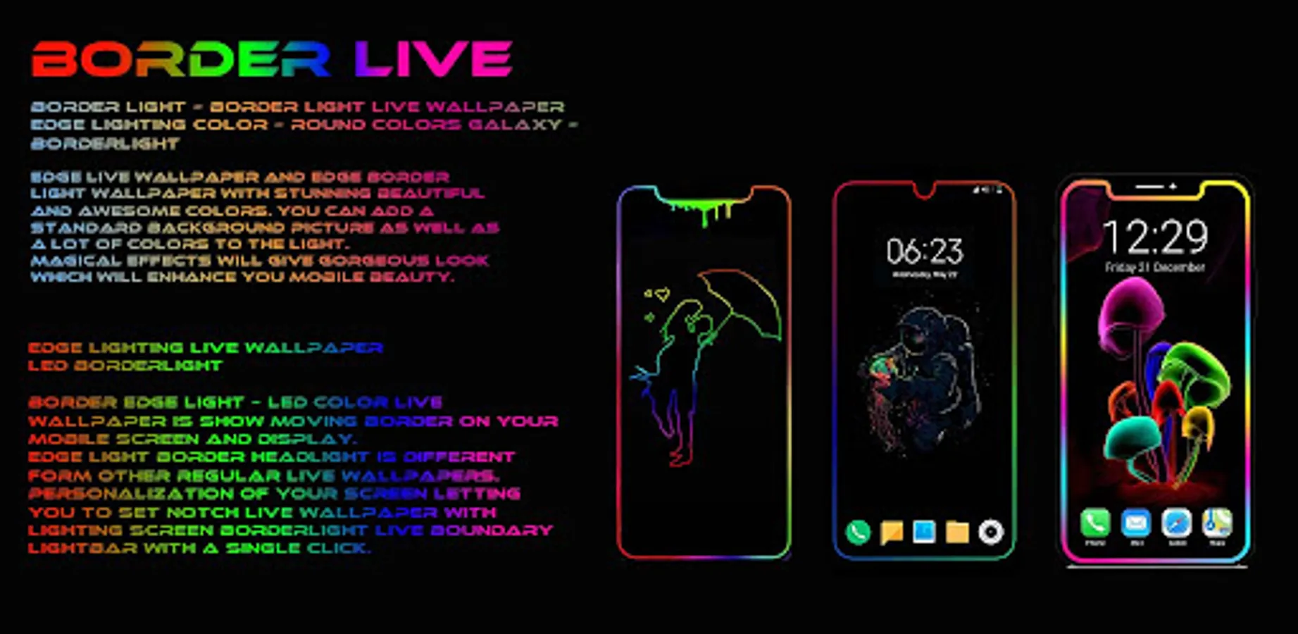 Border Edge Light – LED Color Live Wallpaper is show moving border on your mobile screen and display. Edge light border headlight is different form other regular live wallpapers. Personalization of your screen letting you to set notch live wallpaper with lighting screen borderlight live boundary lightbar with a single click.